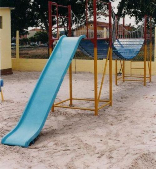 aterial: Estrutura em aço, assoalho da ponte em madeira, sendo a prancha do escorregador em fibra de vidro. Utilizamos correntes galvanizadas e soldagem MIG